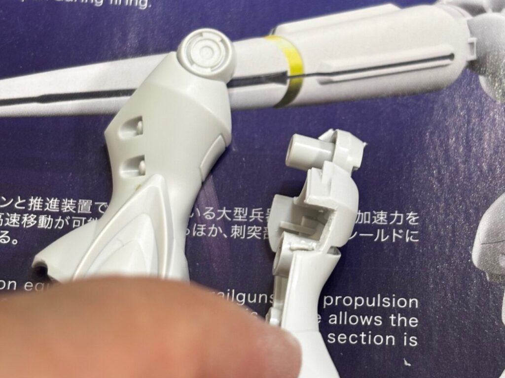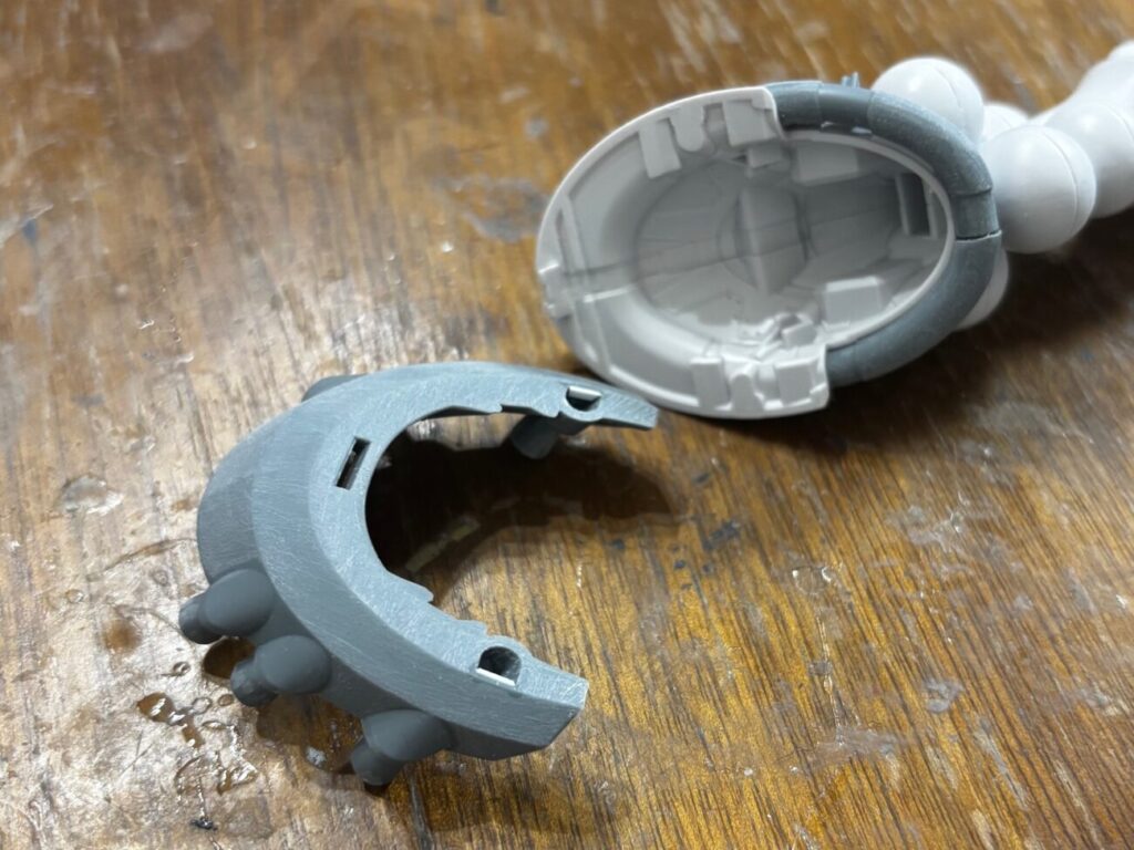 ここは袖口の丸部分?をカットしてやって、前腕は肘パーツを挟み込んで接着します。